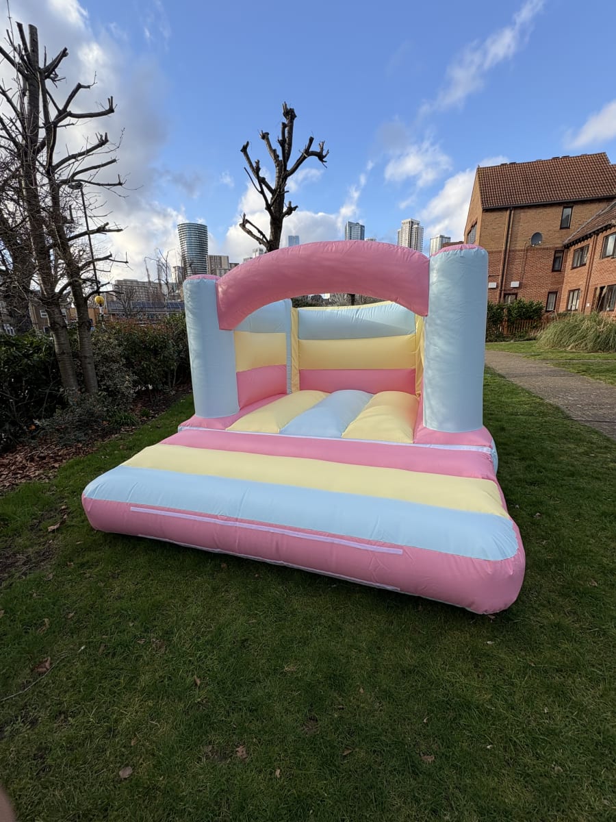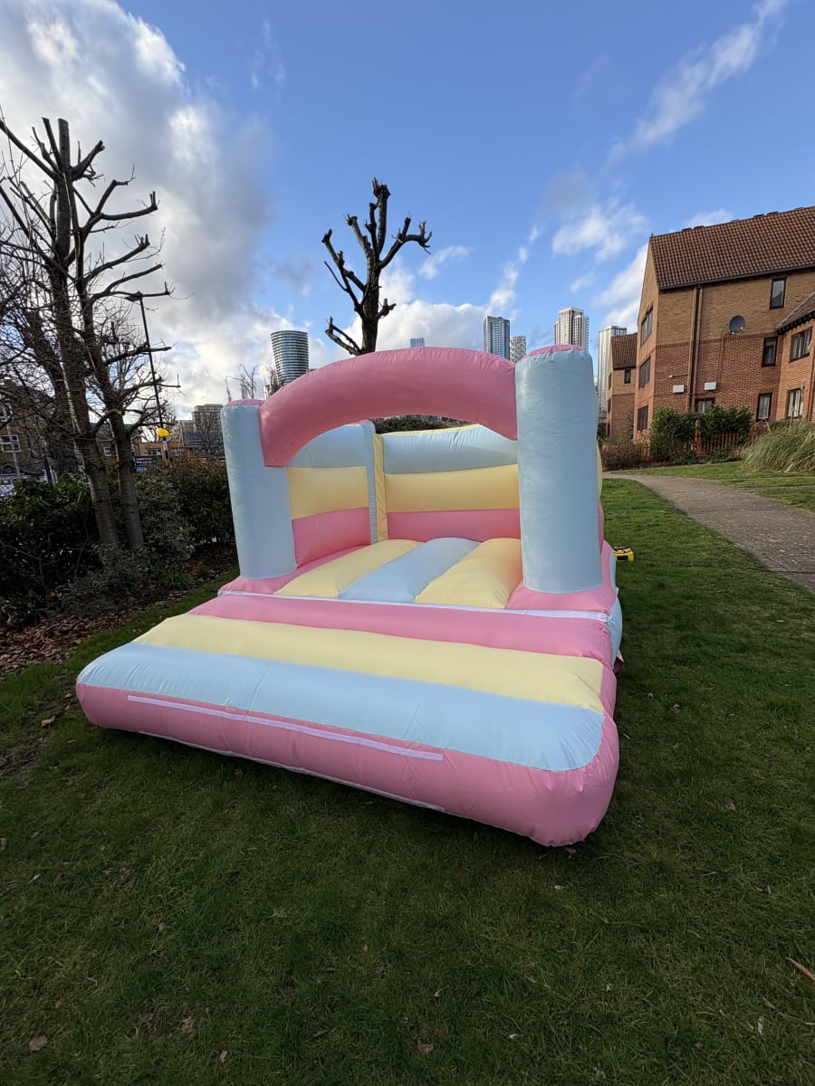 Ready to book? Get a fast quote for Bouncy castle hire 10ft x 12ft pastel 4 post arched in East London/ Essex. 📍 Contact us for availability, pricing, and delivery for Party hire, kids party, weddings and more. 🎉